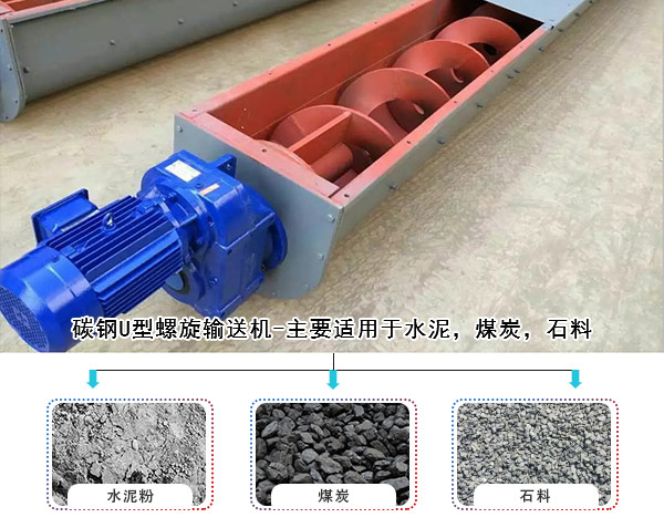 1,普通碳鋼U型螺旋輸送機-主要適用于水泥,煤炭,石料,等磨損較大,對物料沒有特殊要求的行業。