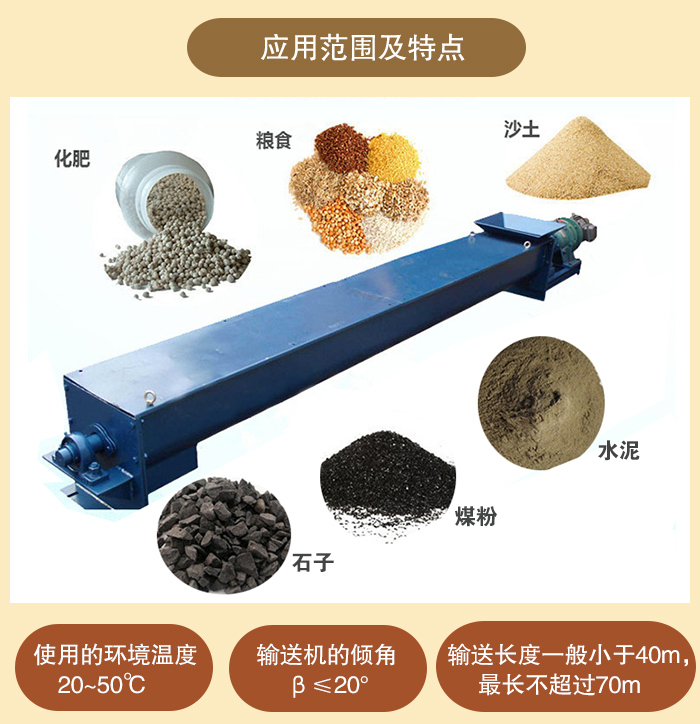 (1)螺旋輸送機(jī)是在化工、建材、糧食等部門中廣泛應(yīng)用的一種輸送設(shè)備,主要用于輸送粉狀、顆粒狀和小塊狀物料。它不適宜輸送易變質(zhì)的、粘性的和易結(jié)塊的物料。