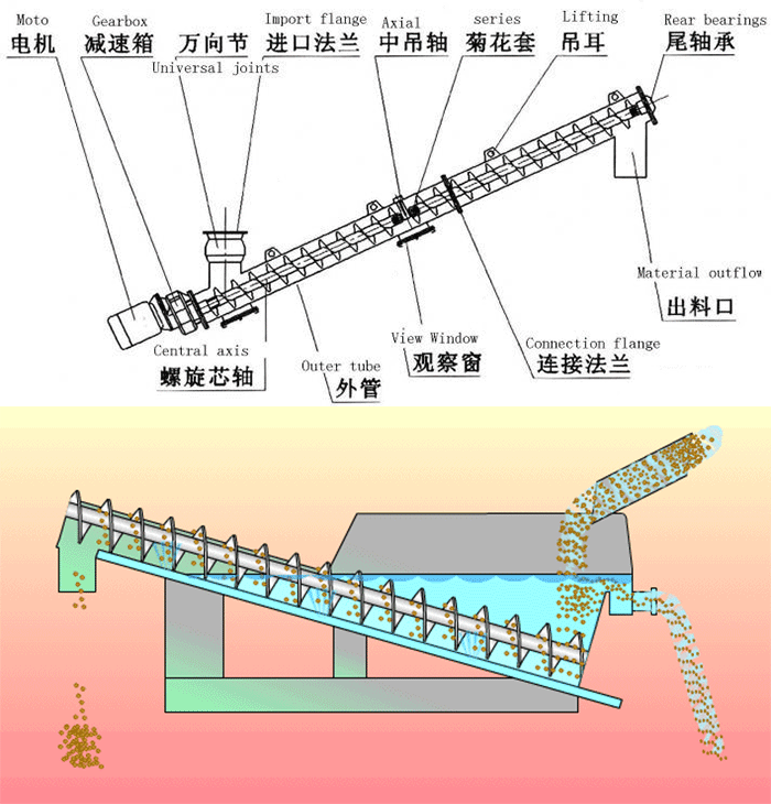水平螺旋輸送機是將物料均勻地喂送到下道工序中,在驅動裝置中電動機帶動減速機,再由聯軸器傳遞給螺旋軸當物料從進料口進去后,在螺旋葉片的作用下將物料均勻輸出。