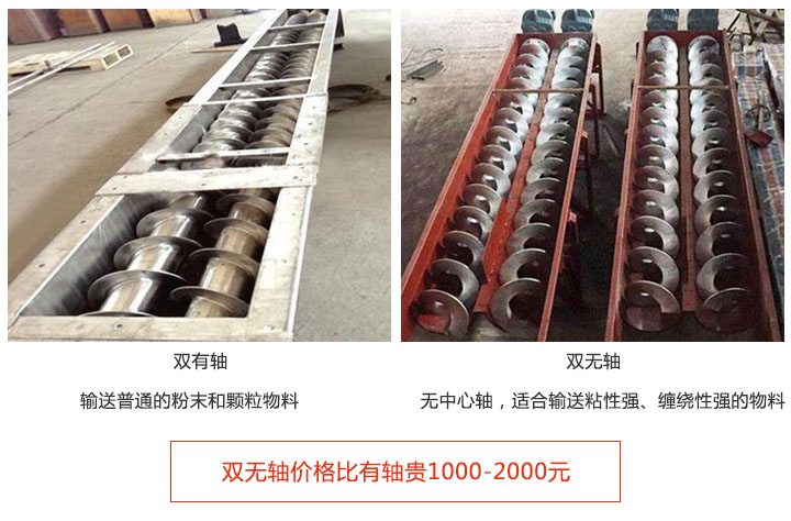 注:雙無軸螺旋輸送機價格比有軸貴1000-2000元,因為采用無軸設計,可解決易纏繞物料的輸送,且設計難度比有軸大。
