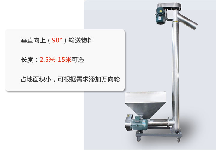 垂直螺旋輸送機(jī)用于解決需要垂直向上(90°)輸送物料的難題,其長(zhǎng)度2.5米-15米,大家可根據(jù)需要選擇長(zhǎng)度;相比普通螺旋輸送機(jī),該款設(shè)計(jì)更好的節(jié)約了占地面積,也可根據(jù)場(chǎng)地需要添加移動(dòng)輪,方便來回移動(dòng)。