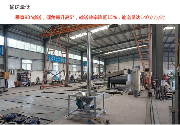 垂直螺旋輸送機(jī)采用垂直輸送的方式,其傾角為90°,在輸送中,輸送機(jī)的傾角每升高5°,輸送效率就會(huì)降低15%,因而造成輸送量較低,只能達(dá)140立方/時(shí)。