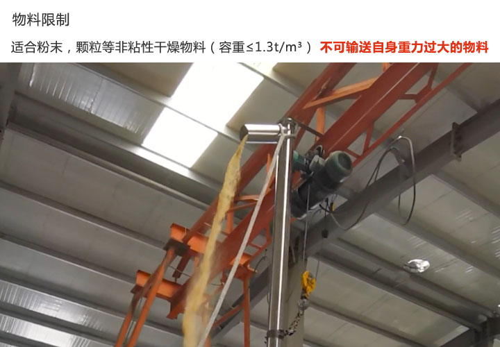 垂直螺旋輸送機(jī)只用于輸送粉末或固體顆粒等非粘性干燥物料(容重≤1.3t/m³),因?yàn)槠洳捎孟蛏陷斔停谳斔瓦^程中物料自身重力如果過重,會(huì)造成輸送難以進(jìn)行。