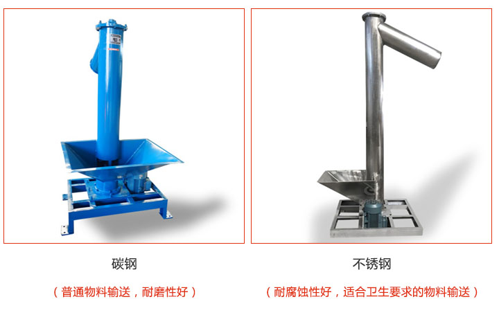 垂直螺旋輸送機材質有碳鋼和不銹鋼兩類,碳鋼適合普通物料輸送,耐磨性好;不銹鋼適合醫藥,食品,化工行業的大豆,藥品,化工粉末等物料的輸送,耐腐蝕性好,不易生銹,干凈衛生;不銹鋼價格比碳鋼高出500-3000元左右。
