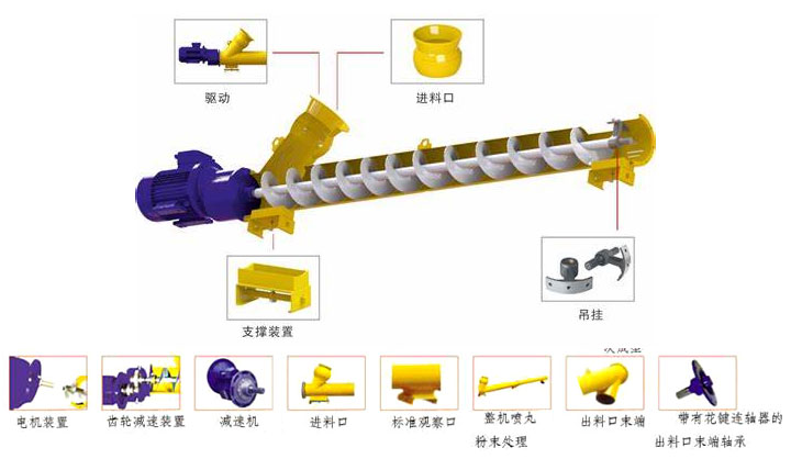 水泥螺旋輸送機由進料口,出料口,電機,減速機,螺旋葉片,螺旋管體,等組成,附帶電纜線,連接帆布套,吊掛鋼絲繩等配件。