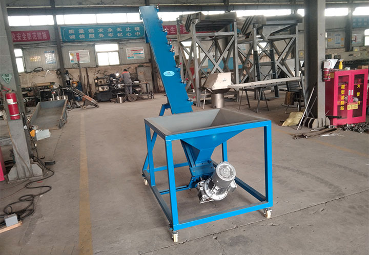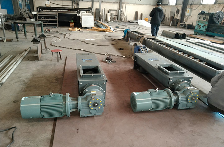 堿粉U型螺旋輸送機啟動后,堿粉從進料口位置被投料到U型槽內,通過電機帶動螺旋軸旋轉產品向前的推力,這樣堿粉就被螺旋葉片推著往前移動,直至出料口位置排出;U型槽設計,輸送時,堿粉可以任意點進料。