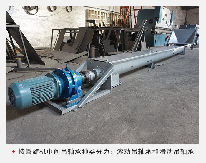 按螺旋機中間吊軸承種類分為:M1—為滾動吊軸承,采用80000型密封軸承,軸蓋上另有防塵密封結(jié)構(gòu),常用在不易加油,不加油或油對物料有污染的地方,密封效果好,吊軸承壽命長,輸送物料溫度≤80℃(訂貨時可不注明)。M2—為滑動吊軸承,設防塵密封裝置,常用在輸送物料溫度比較高(>80℃),或輸送液狀物料