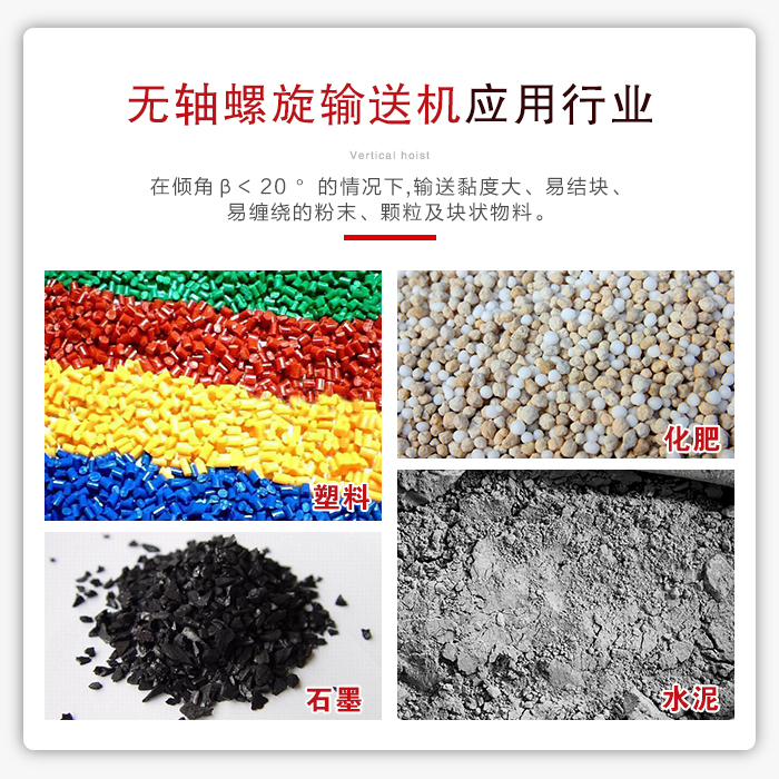 無軸螺旋輸送機廣泛用于食品、醫藥、化工、 建筑等部門,在傾角β< 20 °的情況下,輸送黏度大、易結塊、易纏繞的粉末、顆粒及塊狀物料。