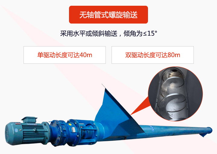 無軸?管式螺旋輸送機(jī)也叫管式無軸螺旋輸送機(jī),其外形為圓管式,可水平或傾斜輸送,其傾角為≤15°,有雙驅(qū)動(dòng)和單驅(qū)動(dòng)之分,單驅(qū)動(dòng)螺旋機(jī)長度可達(dá)40m,雙驅(qū)動(dòng)螺旋機(jī)采用中間斷開軸結(jié)構(gòu),長度可達(dá)80m。由于采用了無軸設(shè)計(jì),可輸送粘性強(qiáng)、易纏繞的物料,物料不易堵塞,排料口不堵塞。
