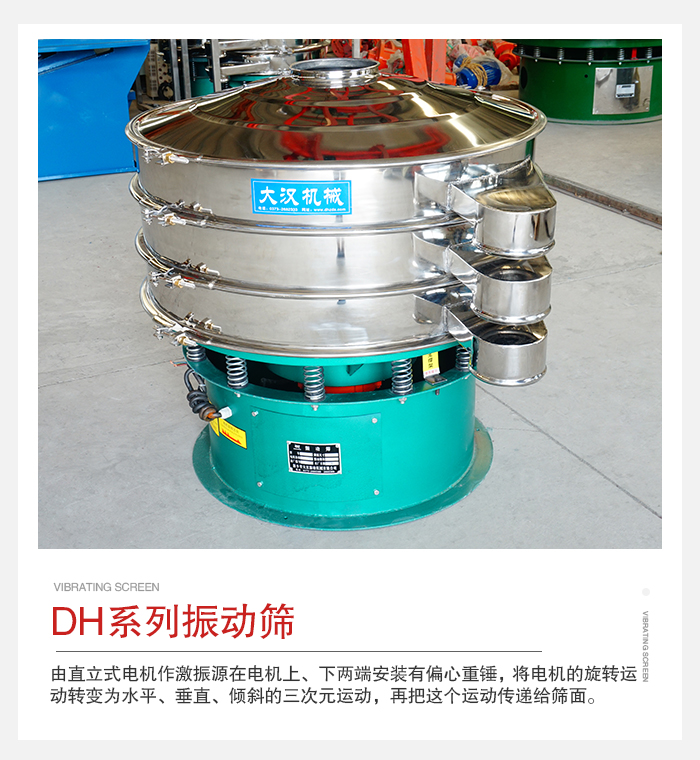 簡介:DH系列振動篩是一種高精度細粉篩分機械其振動運轉原理很多企業也稱之為“三次元振動篩”。