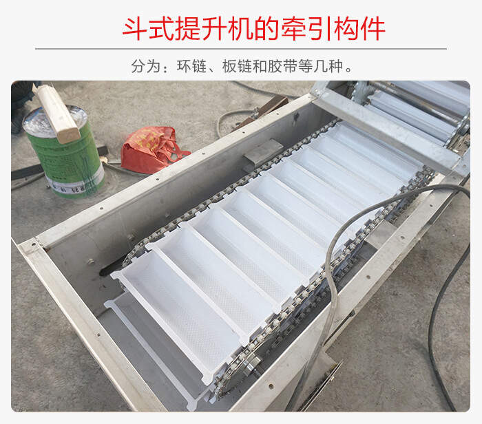環鏈的結構和制造比較簡單,與料斗的連接也很牢固,輸送磨琢性大的物料時,鏈條的磨損較小,但其自重較大。板鏈結構比較牢固,自重較輕,適用于提升量大的提升機,但鉸接接頭易被磨損,膠帶的結構比較簡單,但不適宜輸送磨琢性大的物料,普通膠帶物料溫度不超過60°C,夾鋼繩膠帶允許物料溫度達80°C,耐熱膠帶允許物料溫度達120°C,環鏈、板鏈輸送物料的溫度可達250°C。