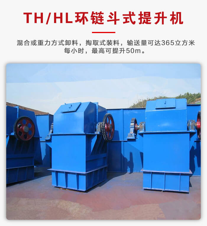 TH/HL環鏈斗式提升機牽引機構是兩根環形鏈條,為混合或重力方式卸料,掏取式裝料,輸送量可達365m3/h,最高可提升50m。